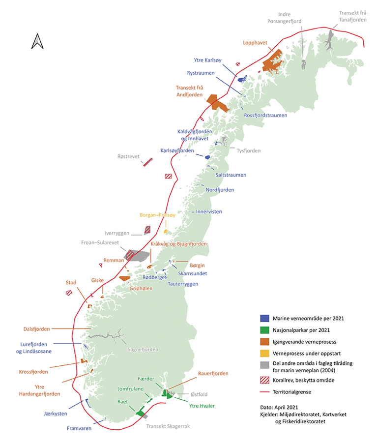 Da det internasjonale miljøsamarbeidet for ti år siden satte som mål at 10 prosent av verdens hav- og kystområder skulle være bevart innen 2020 (Aichi-målene), var begrunnelsen at marine verneområder (MPA) og andre effektive arealbaserte forvaltningstiltak (OECM) bidrar til å beskytte habitater og bevare natur og biologisk mangfold. I Havpanelets rapport om nøkkelhabitater og biologisk mangfold drøftes forslag om å utvide dette til vern av 30–40 prosent før 2030. I Norge er om lag halvparten av havområdene under norsk jurisdiksjon – ved fastlandet, Svalbard, Jan Mayen og Bouvetøya – underlagt en lang rekke ulike arealbaserte forvaltningstiltak. Rundt 5 prosent av dette er marine verneområder, og cirka 45 prosent er andre effektive arealbaserte tiltak etter fiskerilovgivningen. Det foreligger planer om oppretting av ytterligere cirka 15 marine verneområder i årene fremover, det meste av dette innenfor territorialfarvannet (figur 2).