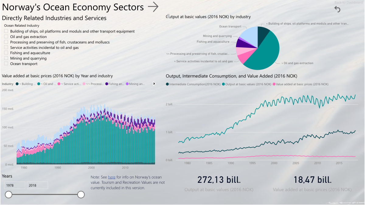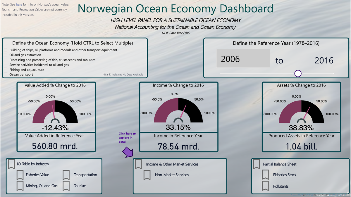 - Legg til rette for at Havregnskapet gjøres lett tilgjengelig for alle beslutningstagere i samfunnet blant annet gjennom visualiseringer i interaktive data «dashboard». Sørg for at visualiseringene av regnskapsdata viser at naturressursene i havet er begrenset.
